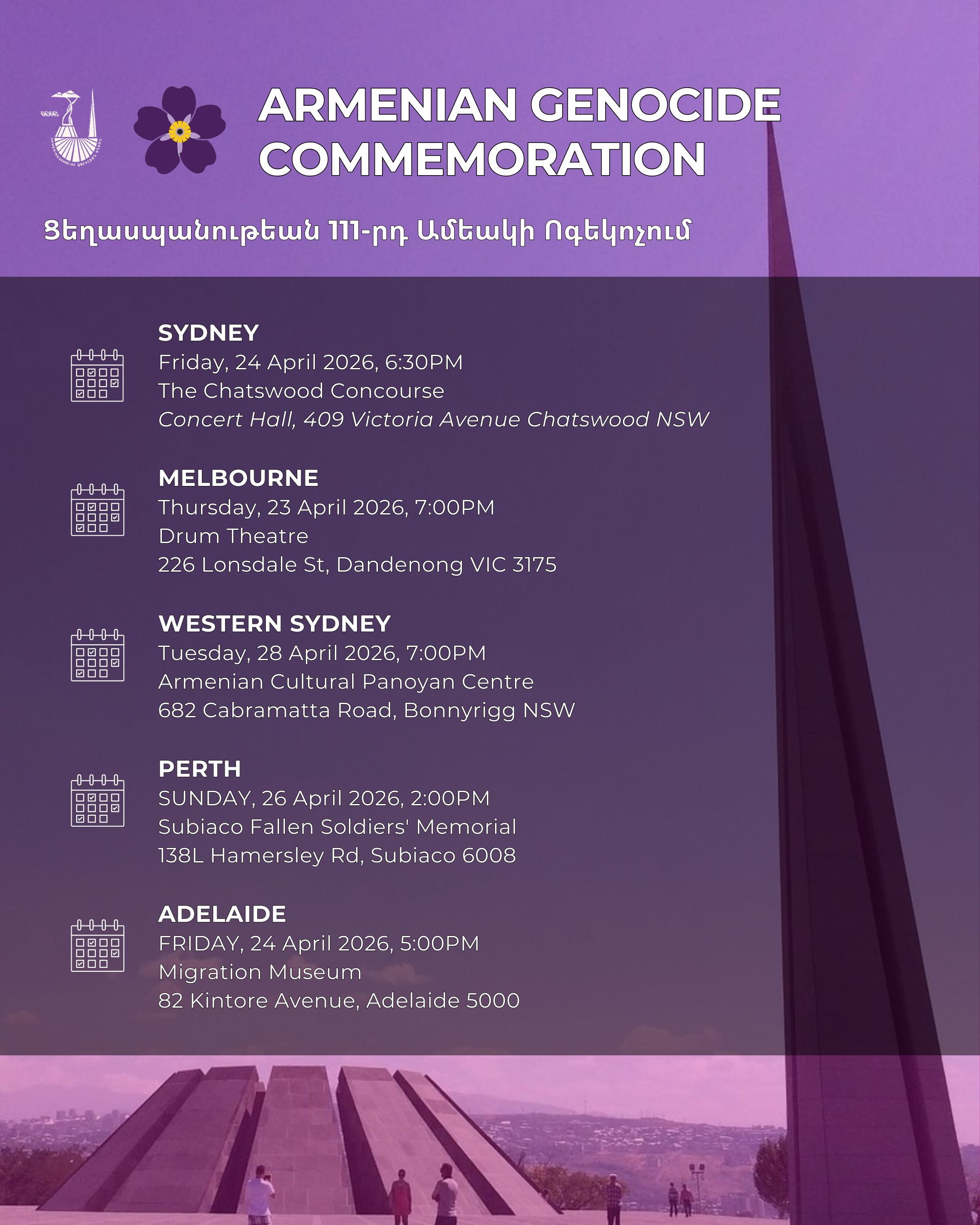 The Armenian Genocide Commemorative Committee has released the calendar of events that will mark the 111th Anniversary of the Armenian Genocide across Australia.