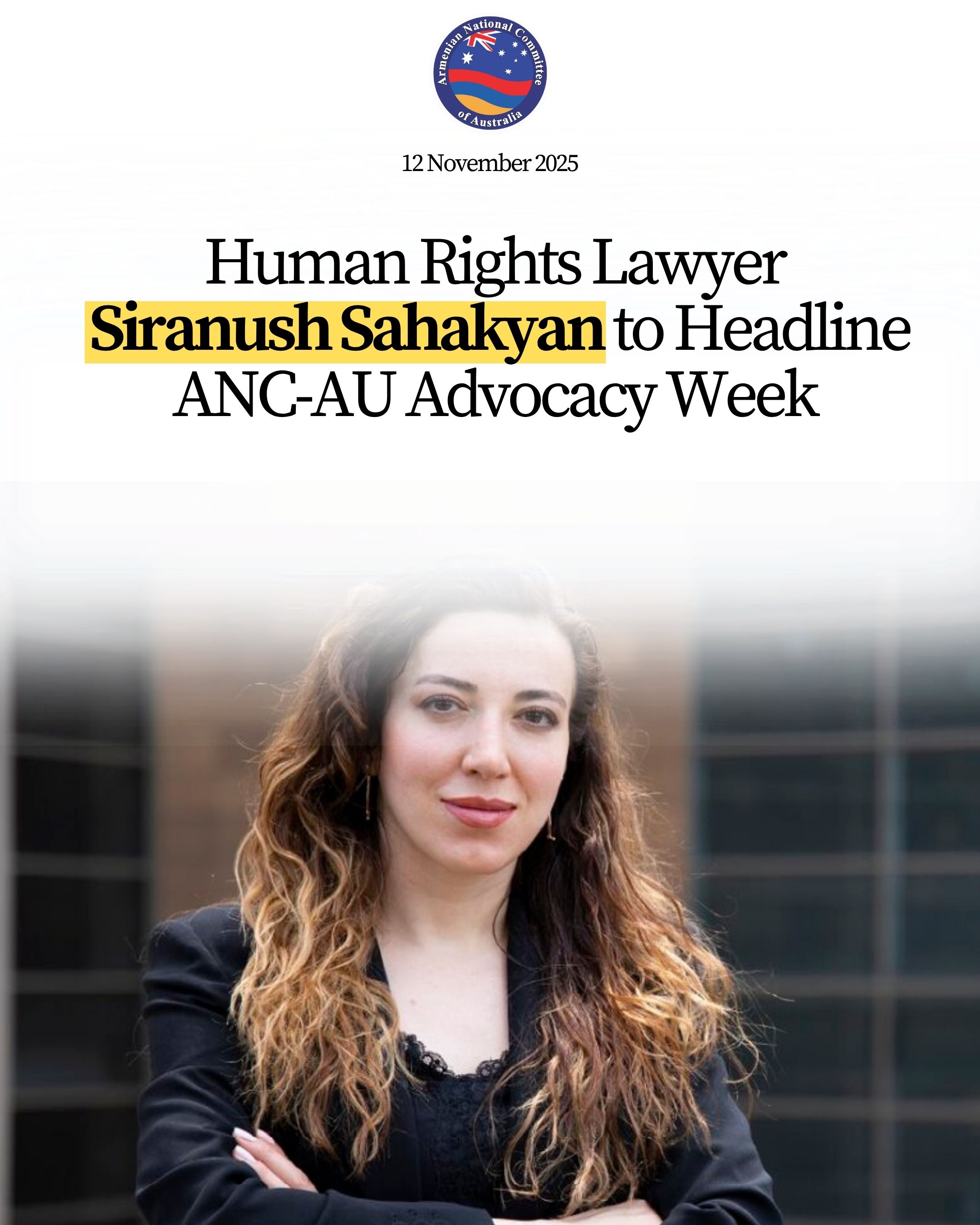SYDNEY/MELBOURNE/CANBERRA: The Armenian National Committee of Australia (ANC-AU) has announced Ms Siranush Sahakyan will be visiting from Armenia to headline the organisation’s 2025 Advocacy Week from 24–30 November 2025.