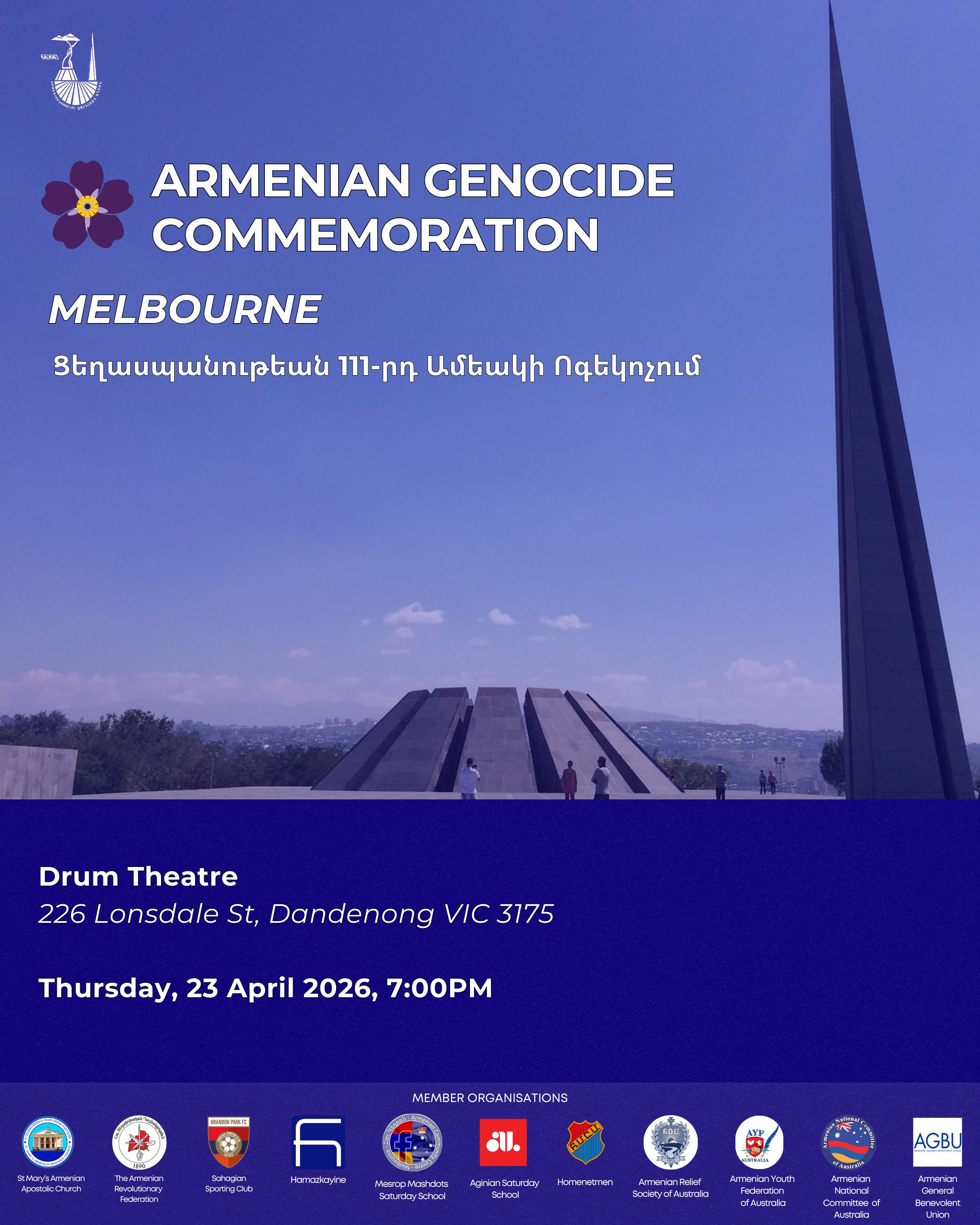 This annual event, which will be held at The Drum Theatre (226 Lonsdale St, Dandenong VIC 3175) on Thursday, 23 April 2026, commencing from 7:00pm, will be attended by approximately 300 members of Melbourne’s Armenian community, along with fellow community, religious, political, media, diplomatic and academic leaders from across the country.