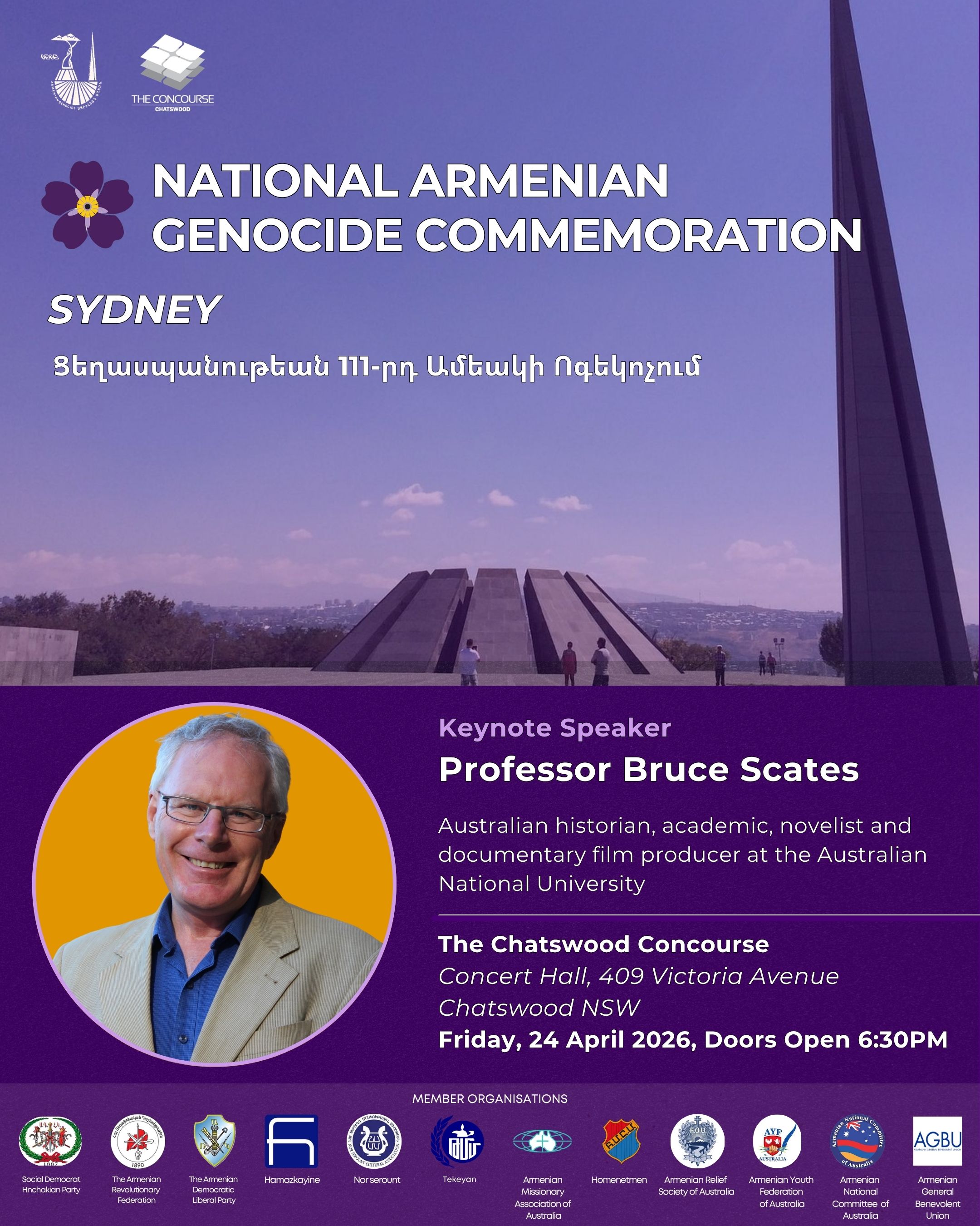 SYDNEY: To mark the 111th Anniversary of the Armenian Genocide, Professor Bruce Scates - a renowned Australian war historian - will provide the keynote address at the National Armenian Genocide Commemoration in Sydney on Friday, 24 April 2026, 6:30pm at the Chatswood Concourse.