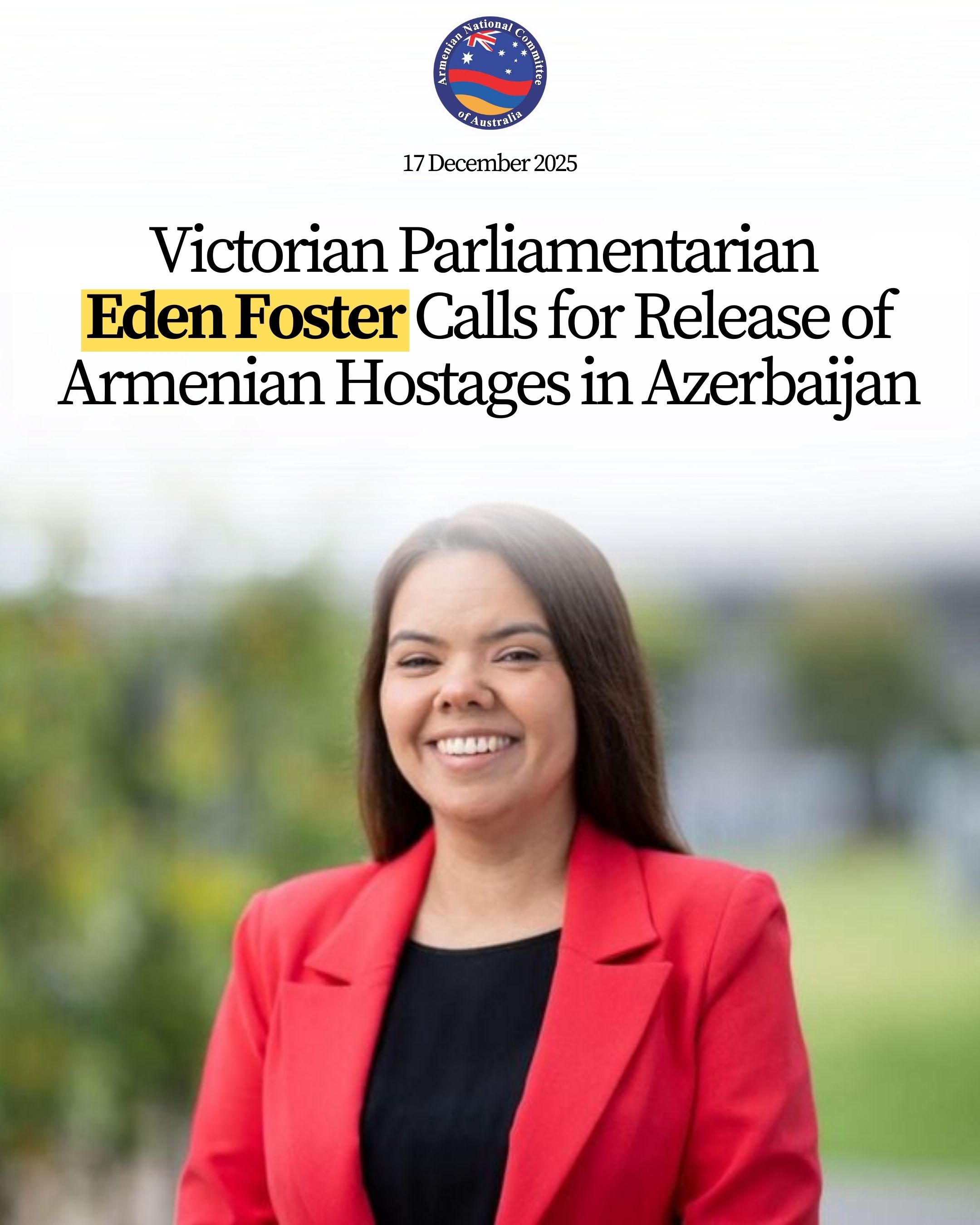 Foster delivered the Members Statement on Tuesday, 9 December 2025, after attending the ANC-AU Melbourne Gala on 30 November 2025 and having met with the organisation’s 2025 Advocacy Week Guest, Ms Siranush Sahakyan.